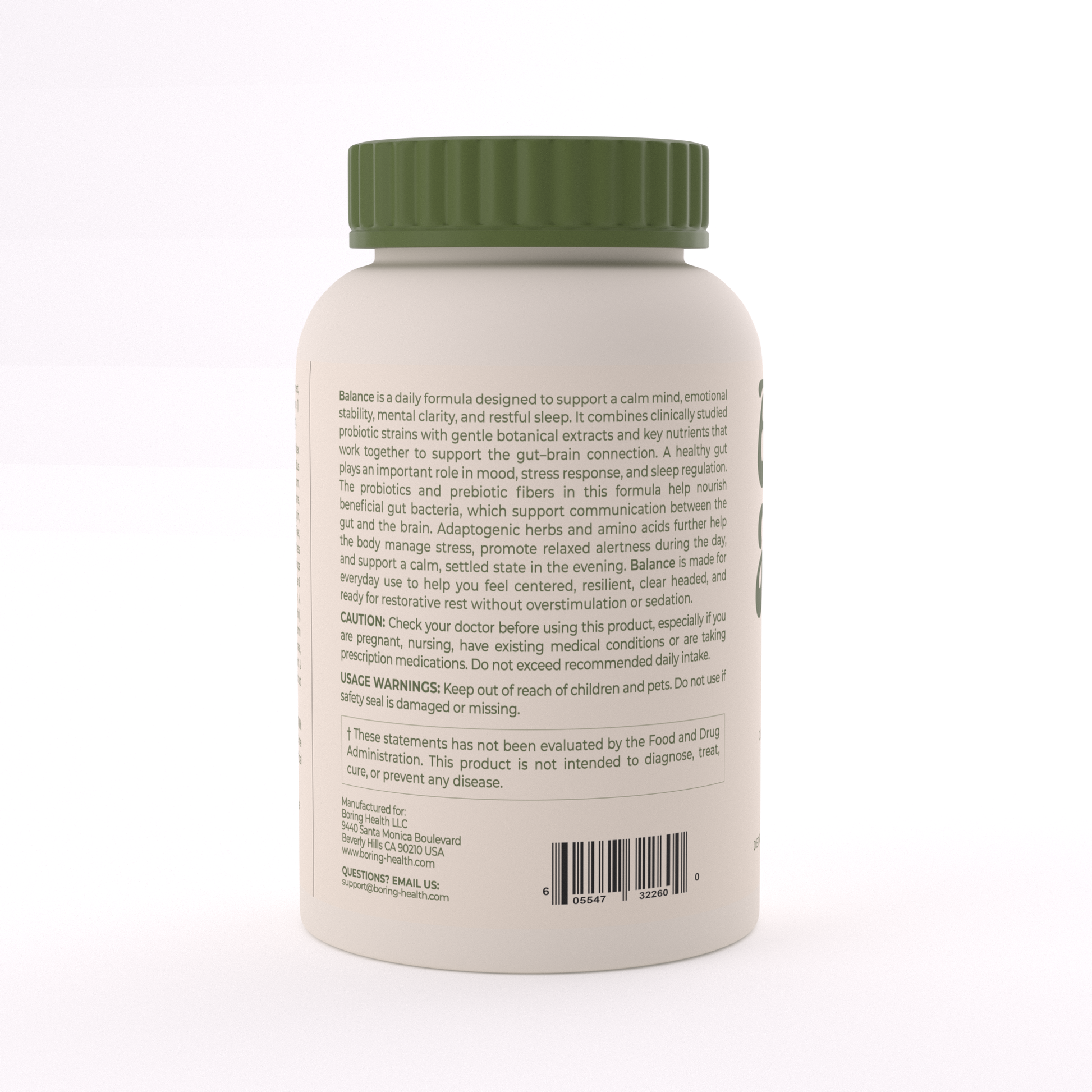 Balance is a daily gut brain support formula designed to promote emotional stability, mental clarity, and steady energy. It combines clinically studied probiotic strains with prebiotics, gut barrier nutrients, and botanical adaptogens to support communication between the gut and the nervous system.