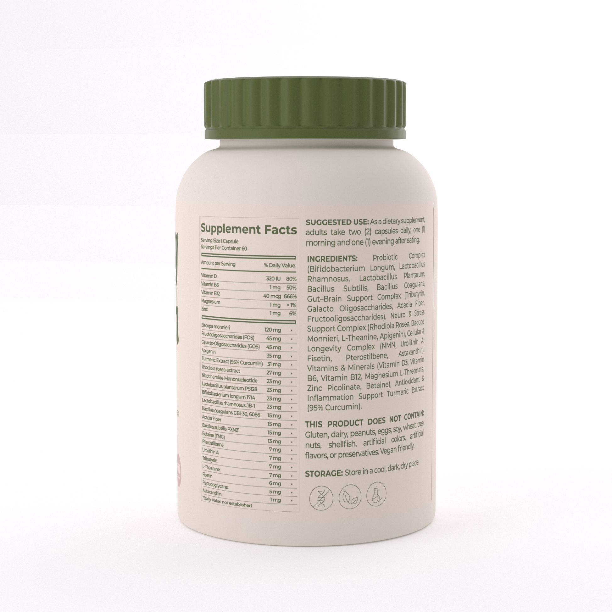 Probiotic Complex (Bifidobacterium Longum, Lactobacillus Rhamnosus, Lactobacillus Plantarum, Bacillus Subtilis, Bacillus Coagulans) Gut Brain Support Complex (Tributyrin, Galacto-Oligosaccharides, Fructooligosaccharides, Acacia Fiber) Neuro & Stress Support Complex (Rhodiola Rosea, Bacopa Monnieri, L-Theanine, Apigenin) Cellular & Longevity Complex (NMN , Urolithin A, Fisetin, Pterostilbene, Astaxanthin) Vitamins & Minerals (Vitamin D3, Vitamin B6, Vitamin B12, Magnesium L-Threonate, Zinc Picolinate, Betaine) Antioxidant & Inflammation Support Turmeric Extract (95% Curcumin).